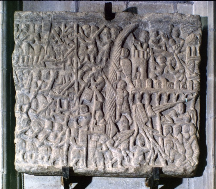 Dans les notes d'un voyage dans le Midi de la France (1835), Prosper Mérimée indique la chose suivante : Dans la muraille d'une des chapelles latérales, ajoutées à la nef, on voit un bas-relief fort curieux, quoique d'un travail grossier, représentant l'attaque d'une place forte. L'historien Jean Blanc nous donne des précisions sur l'origine probable de cette pierre : "Après la mort de Simon de Montfort, survenue lors du siège de Toulouse le 23 juin 1218, son fils, Amaury se rend à Carcassonne en emportant le corps. Guillaume de Puylaurens précise bien que le corps de Simon avait été "préparé selon l'usage français". Cela signifie que l'on avait fait bouillir la dépouille afin de pouvoir mieux séparer la chair et les entrailles du squelette". Michel Roquebert, pense que chair et entrailles reçurent sépulture à Toulouse et que Amaury fit inhumer les ossements dans l'abside Sud de la cathédrale St-Nazaire, dédiée à la Ste-Croix. Cette assertion vient en appui d'un événement connu. En 1219, Alix, comtesse de Montfort, Amaury et Guillaume, ses fils, instituèrent un chapelain dans la chapelle Sainte-Croix pour le repos de l'âme de Simon. Ils firent également donation d'argent pour l'entretien du luminaire et des ossements de l'autel de ladite chapelle.